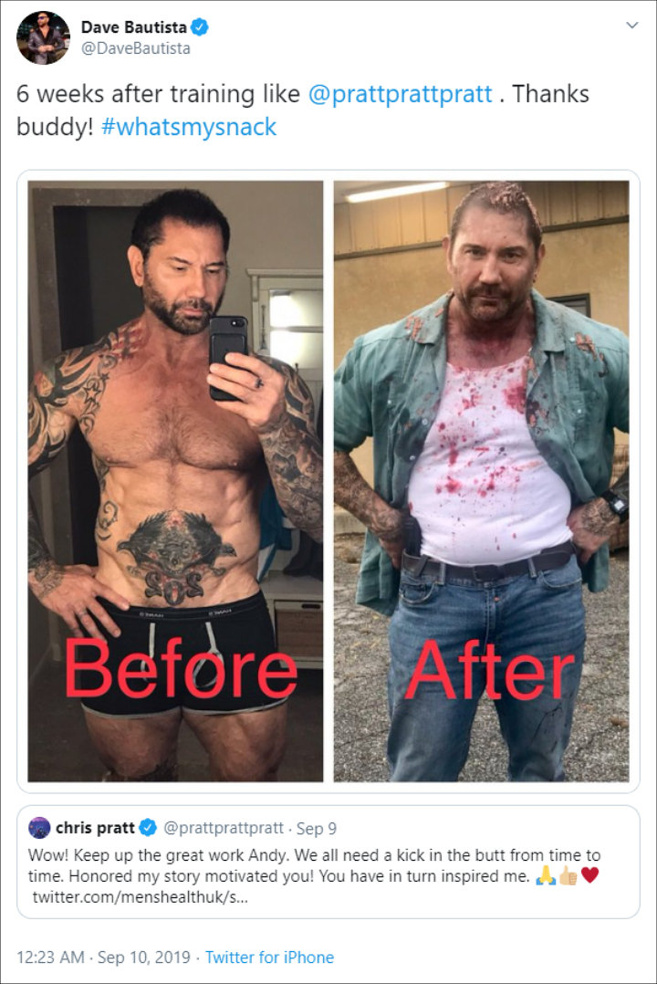 Chris Pratt And Dave Bautista Engage In Hilarious Twitter Banter Over Training Regime The chris pratt workout is all about hard work and consistency, but tools he used to get ripped can be used by chris pratt, who played andy, weighed 280+ pounds during the show.